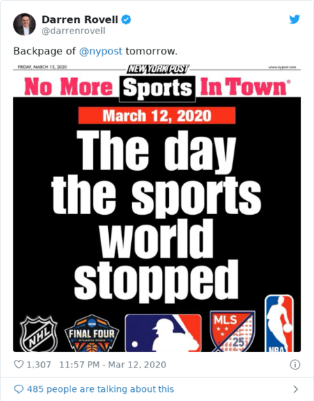 - The March Madness basketball tournaments were canceled for the first time in 82 years. The NCAA also canceled all other winter and spring championships. (Chuck Culpepper and Ava Wallace)